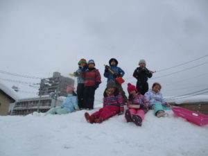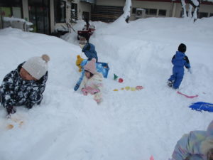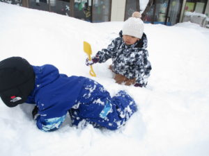大人は雪かきで大忙しですが、子どもたちは雪に大喜びです!