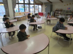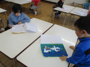 年長組は、冬休み帳を見せ合って