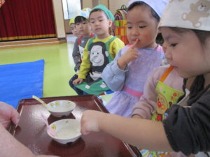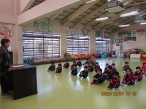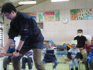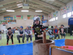 行事の由来を聞いたり歌を歌ったりして、もちつき会が始まりました。