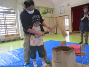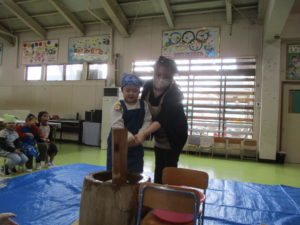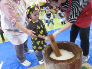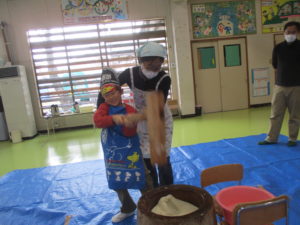 年長組は親子で一緒に餅つきをしました。