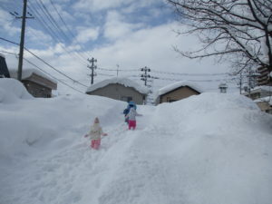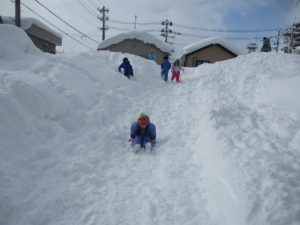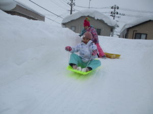 大人は雪かきで大忙しですが、子どもたちは雪に大喜びです!