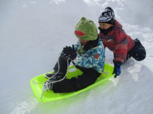子どもたちは高い雪山に登ったりソリで滑ったりしています。