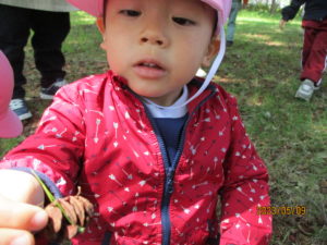 まつぼっくりやどんぐりを見つけて、夢中で集めていました。
