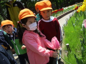 「赤、白、黄色~!」とみんなでちゅうりっぷの歌を歌いながら、畑の中を歩いて行きます。