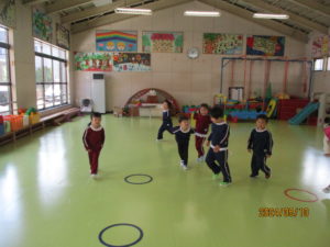 音楽に合わせてホールを歩き、笛の合図で輪の中に入るゲームをしました。