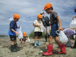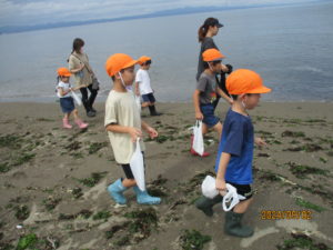 先日、堤小学校の「夏の作品展」へ見学に行き、いちにちようちえんで拾った貝殻をどうするかイメージが沸いた子どもたち。