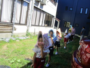 7月のいちにちようちえんの時より草も伸びていたり、川の水が少なかったり、赤とんぼがたくさん飛んでいたり・・・