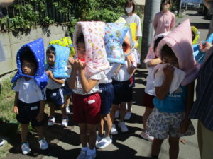 ハンカチで口を押さえて非常口を目指して、低い姿勢で逃げることを学びました。