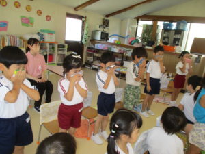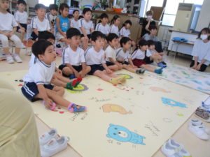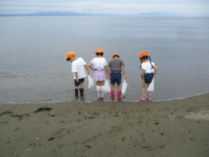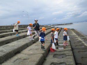先日、堤小学校の「夏の作品展」へ見学に行き、いちにちようちえんで拾った貝殻をどうするかイメージが沸いた子どもたち。