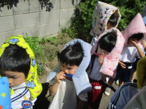 ハンカチで口を押さえて非常口を目指して、低い姿勢で逃げることを学びました。