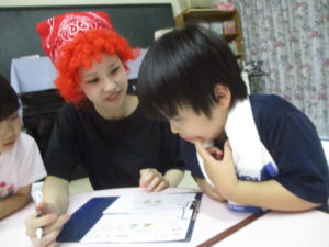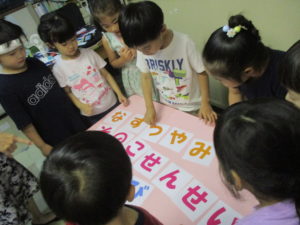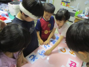アメリカ人はひらがなを並べたいんだけどわからないんだ!と子どもたちは察して頭を使い始めました。