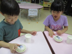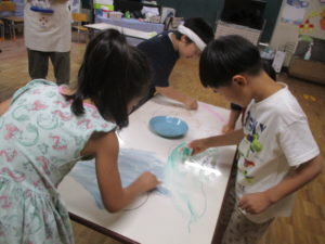 教室に戻ると、年中組は楽しかったしゃぼん玉遊びを、さっそく絵の具で絵に描きました。
