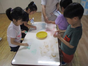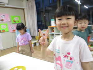 教室に戻ると、年中組は楽しかったしゃぼん玉遊びを、さっそく絵の具で絵に描きました。