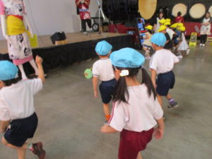 見学した後は、実際に囃子に合わせてみんなでハネトになりました。「ラセラー!ラセラー!」と元気いっぱい跳ねました。