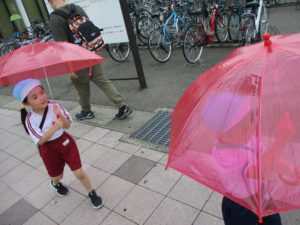 いよいよワラッセに向かいます。雨が降ってきたので傘をさしながら歩きました。