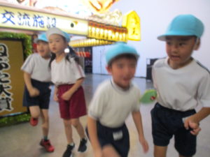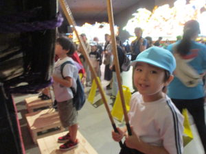 見学した後は、実際に囃子に合わせてみんなでハネトになりました。「ラセラー!ラセラー!」と元気いっぱい跳ねました。