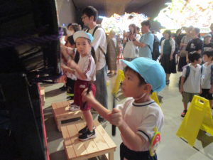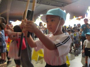 太鼓と手振り鉦の体験もしました。太鼓のバチを持つと急に真剣な表情になって、みんな一生懸命たたいていました。