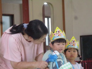 冠をかぶって友達や、おうちの方がたに拍手で迎えられて、にこにこ嬉しそうな誕生児です。